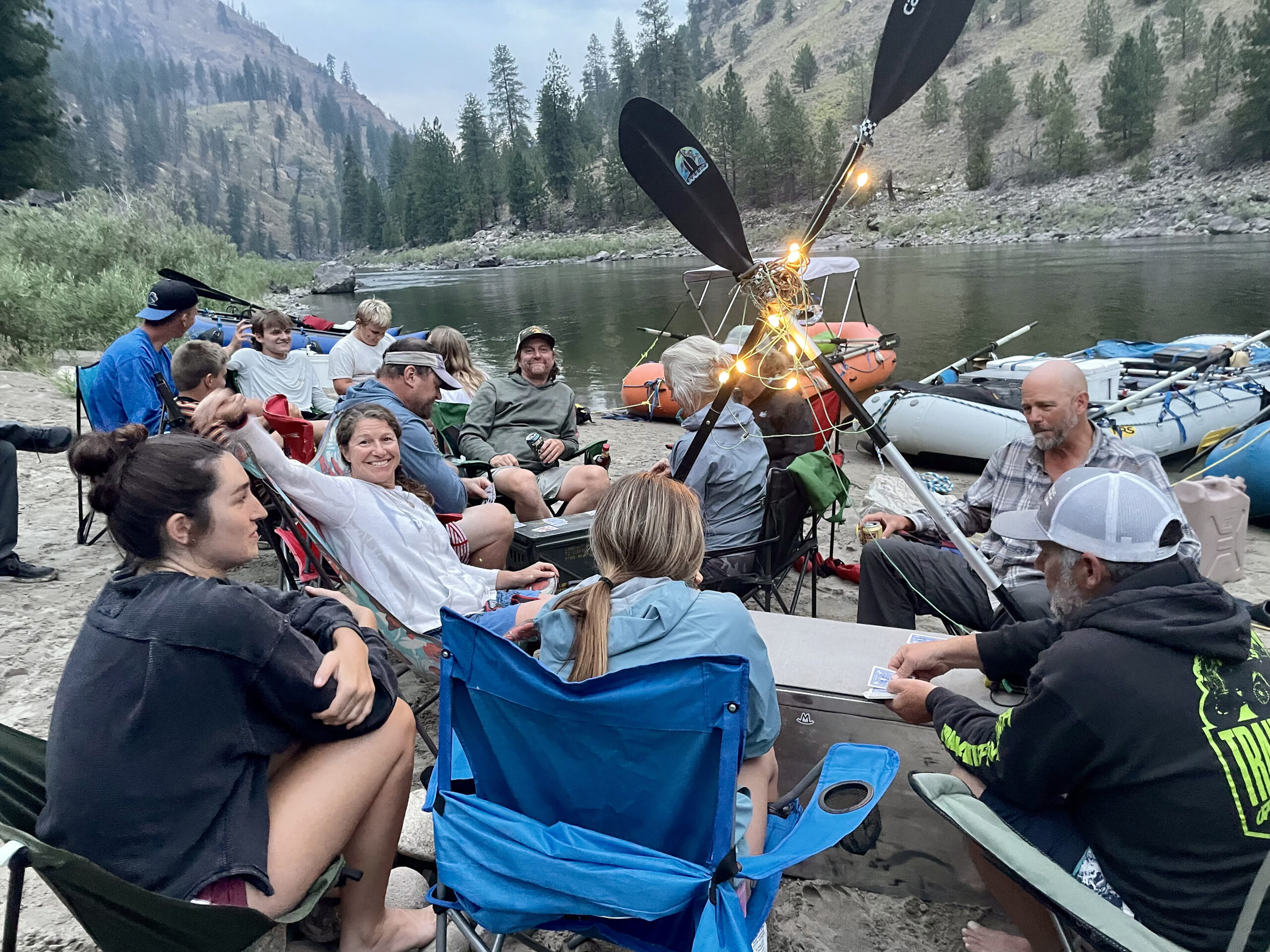 Twinkling string lights substitute for a wood fire when camping a stone’s throw from the leading edge of a forest fire on the Main Salmon.