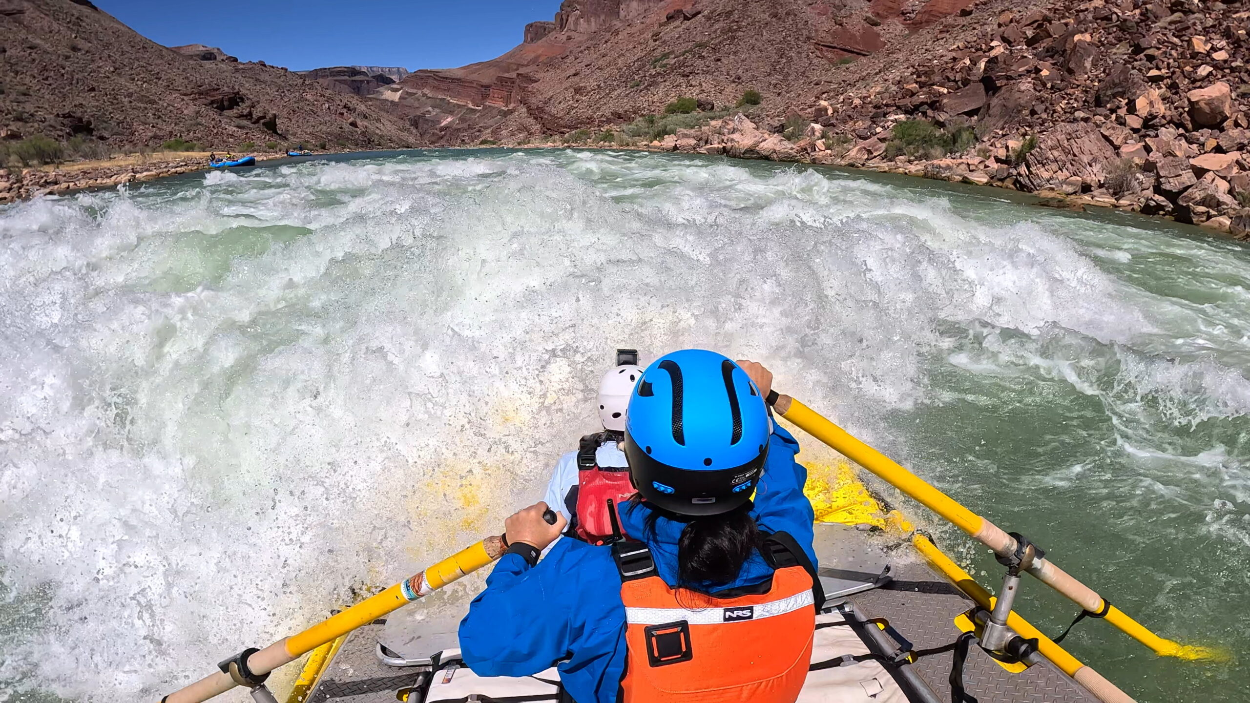 Successful river trips are about team work, even if that simply means a boat buddy hanging on for dear life.