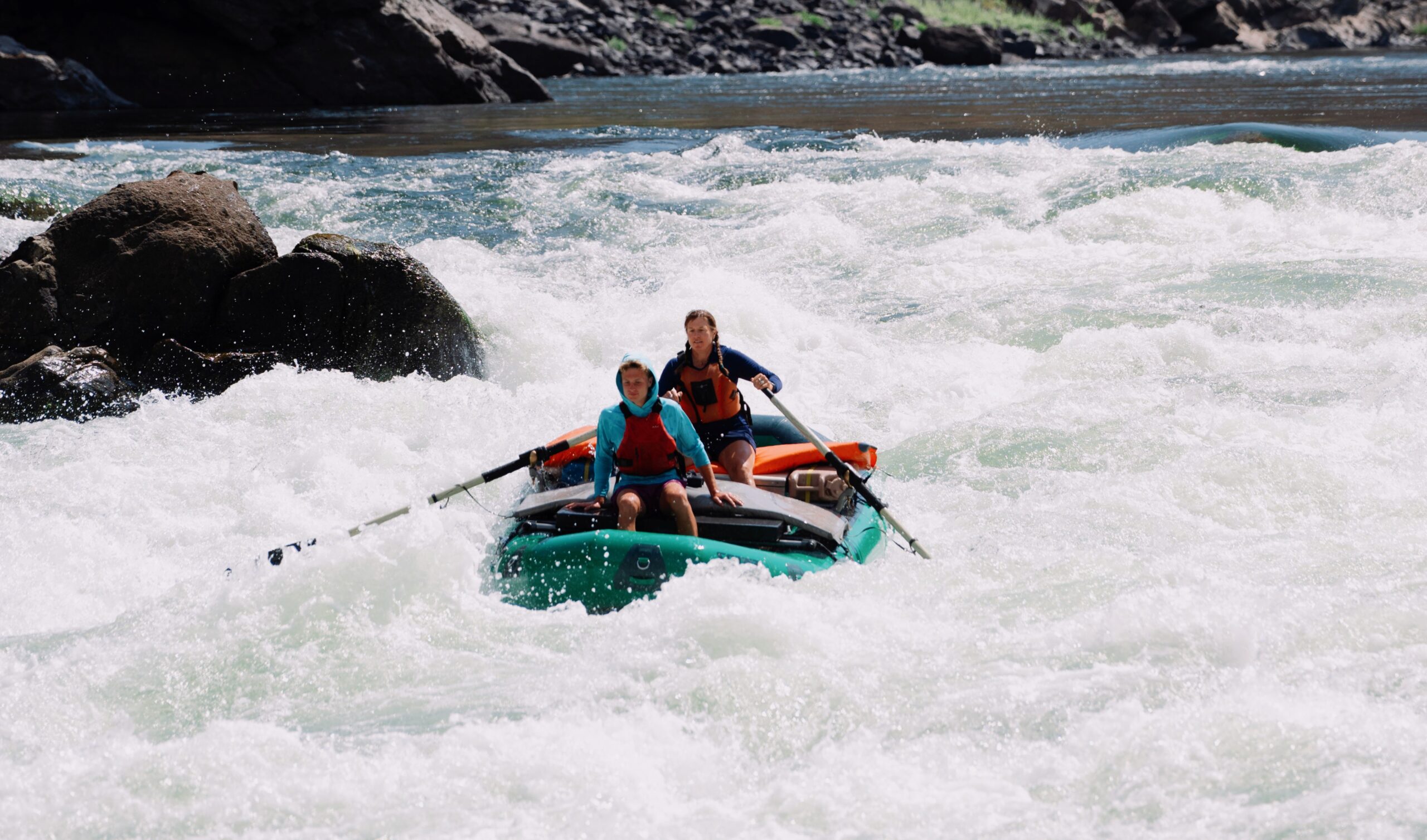 Shot from a rock just below the rapid, this image freezes a moment of pure connection between a mother and her son as they navigate slight chaos together.